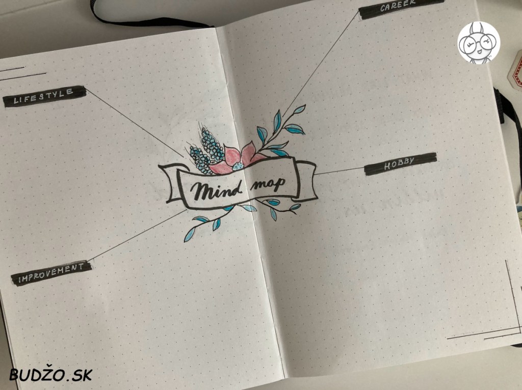 Ďalšia dvojstránka je priamo napojená na moju Vision Board. Prechádzam na myšlienkovú mapu, ktorá mi pomôže usporiadať si myšlienky ohľadom obrázkov z predchádzajúcej dvojstránky. Momentálne som všetky svoje aktivity zaradila do nasledujúcich štyroch kategórií, ktorým sa chcem vedome venovať: