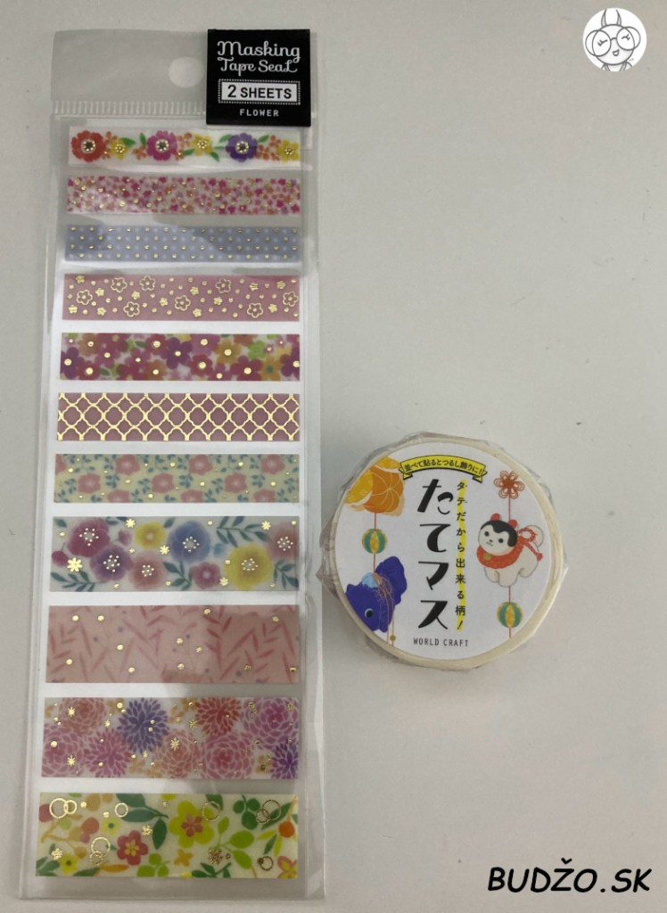 Ďalším pravidelným výrobkom, ktorý sa v tomto predplatnom boxe nachádza, býva washi páska. Autori Zenpop boxu každý mesiac vyberú nejakú, ktorá sa motívom hodí k mesačnej téme. Tá tohto mesačná má vertikálny dizajn a objavíte na nej “ošógacu kazari“, alias novoročné visiace ozdoby. K tomu tento mesiac pribalili aj nádherné útržky washi pások s pozlátenými detailami.