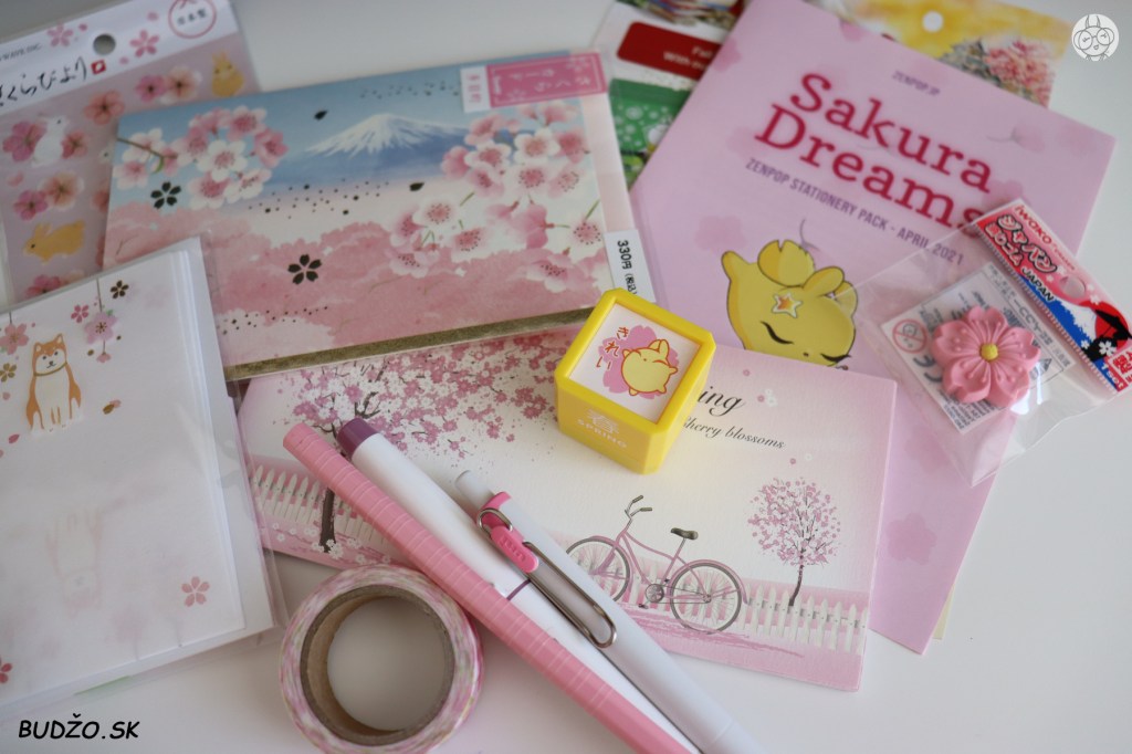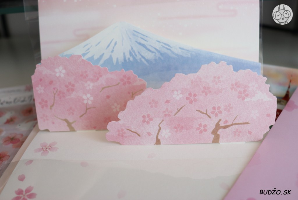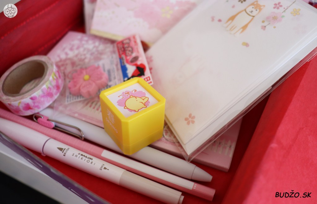 Musím povedať, že s tohto mesačným boxom som bola maximálne spokojná. Z papierenských produktov sa tento mesiac v škatuli nachádzala nádherná pohľadnica s kvitnúcimi sakurami a horou Fuji (na obrázku vpravo), ale i miniatúrna listová súprava s čerešňovými kvetmi a psíkom shiba. Ako i každý mesiac, nemôže chýbať washi páska, samozrejme, takisto celá s krásnym ružovým kvietkovaným dizajnom. Zvyšok papierových výrobkov uzatvárali malé samolepky so zajačikmi a poznámkový blok takisto so sakura dizajnom.