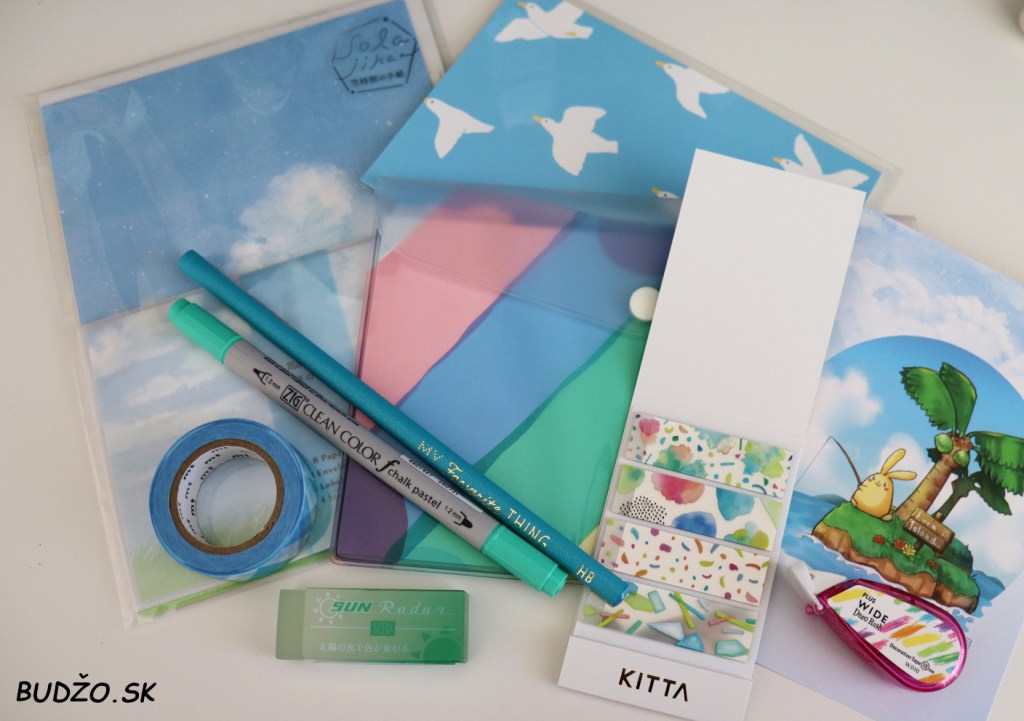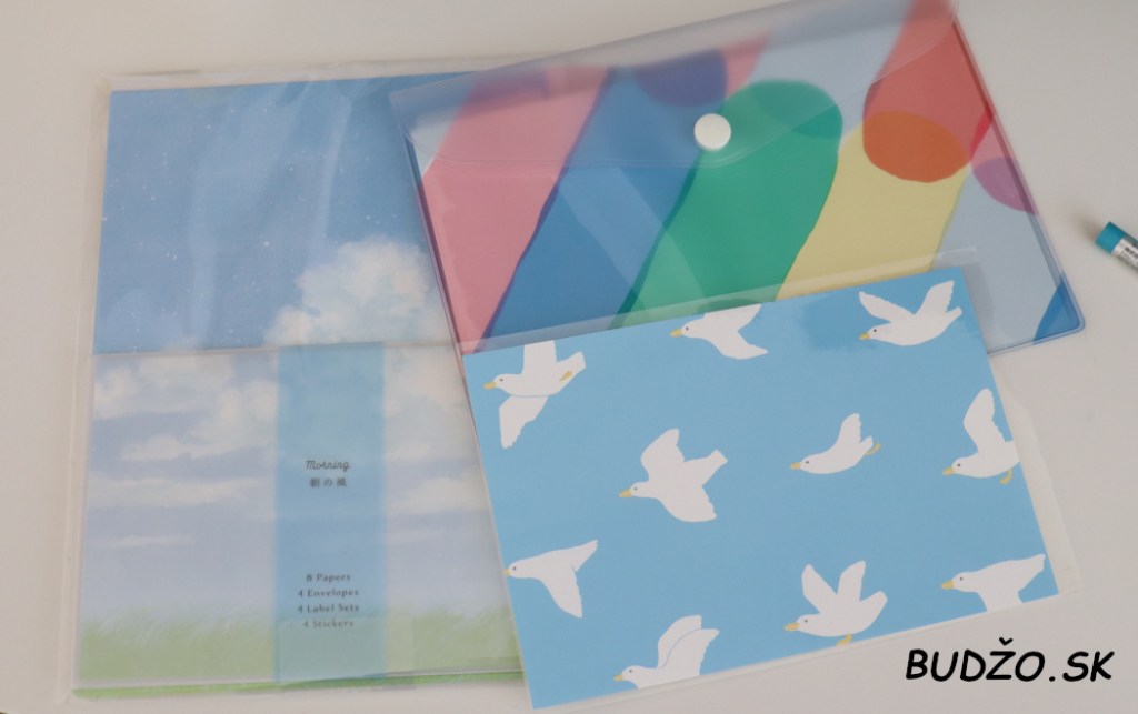 Začnime ako prvými papierenskými produktmi. Tento mesiac sa v ZenPop ukrývala listová súprava od spoločnosti RyuRyu. Set obsahoval priehľadné obálky, ku ktorým sú k dispozícii hárky listového papiera, z jednej strany mali obyčajné riadky, z tej druhej však mali predtlačený nádherný dizajn oblačnej oblohy. K obálkam boli priložené i štyri maličké samolepky s dizajnom papierového lietadielka, ktorými môžete obálku zalepiť, ak máte obavy, že by sa počas cesty odlepila. Okrem toho set obsahoval aj papierové štítky, ktoré môžete na priehľadnú obálku kdekoľvek nalepiť a napísať tak adresu.