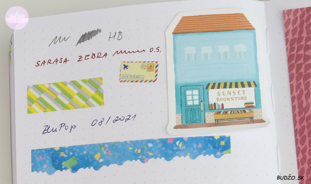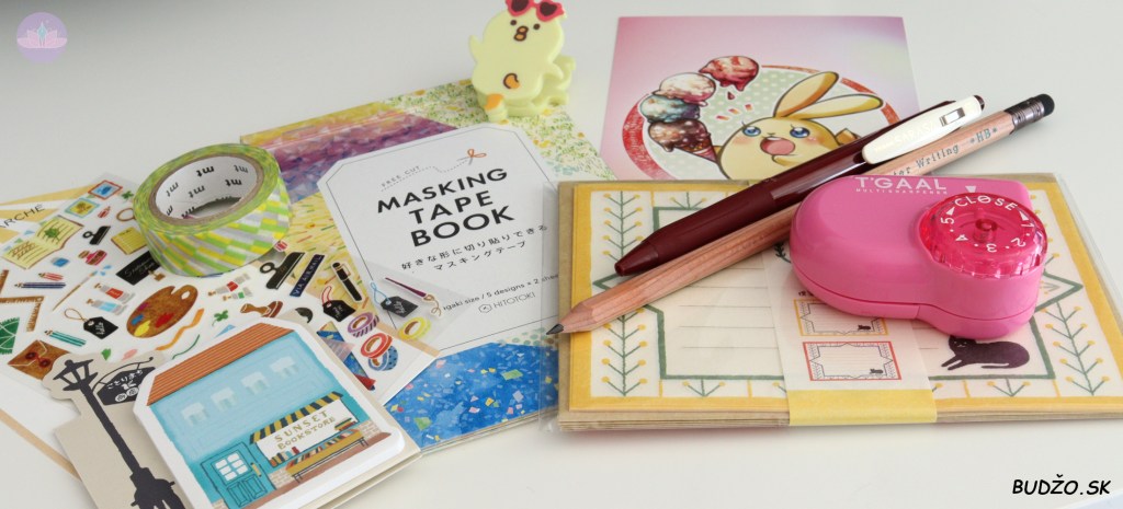 Už tradične sa okrem písacích a kancelárskych potrieb nachádzali v boxe i výrobky papierové. Tentoraz sa tam nachádzala sada samolepiek z japonského washi papiera inšpirovaná francúzskym štýlom. Lepiace lístočky mali tento mesiac dizajn obchodu s knihami. Nechýbala ani štandardná washi páska od mt. Tentoraz boli k dispozícii dva pestrofarebné dizajny s prúžkami, ja som vyfasovala ten zeleno-žltý so striebornými odleskami.