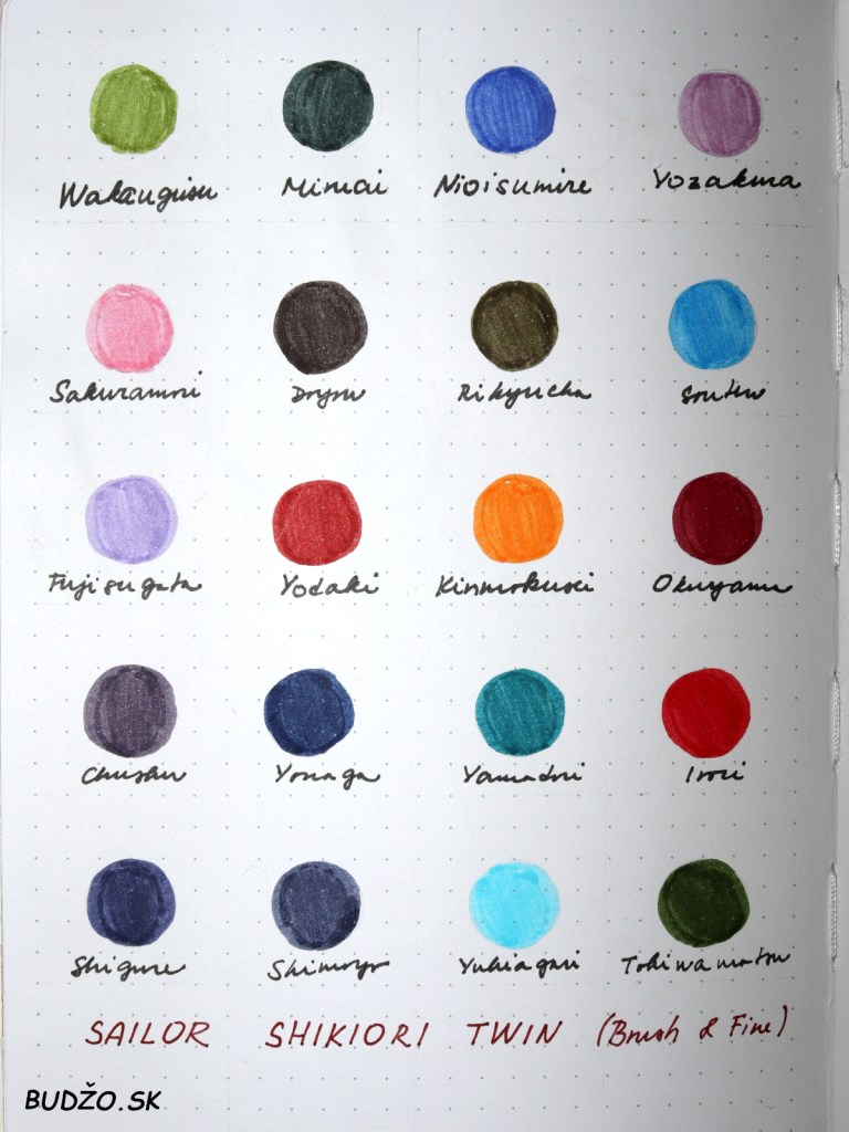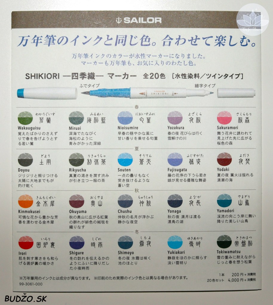 SAILOR Shikiori Twin Markers sú ďalšou novinkou od tejto spoločnosti. Tentoraz sa nejedná o plniace perá, ale o umelecké fixky a ako napovedá ich názov, každá z nich má hneď dva hroty. Jeden je štetcový a veľmi vhodný na kaligrafiu, alebo tzv. lettering, druhá strana, naopak obsahuje veľmi tenký plastový hrot, ktorý využijete hlavne pri písaní tlačeného písma a jednoduchých poznámkach. Farby atramentov týchto fixiek sú navlas rovnaké ako tie do plniacich pier. Paleta bola navrhovaná na základe japonských tradičných farieb, pričom každá jedna z nich symbolizuje . Set Twin Markers obsahuje 20 farieb, pričom každá z nich predstavuje ročné obdobie, japonské zvyky, či obyčaje, alebo tradičné výrobky.