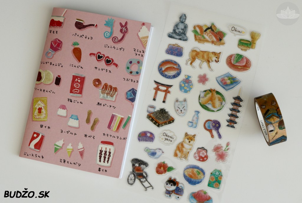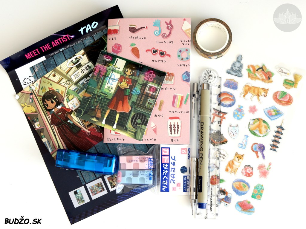 Býva tradíciou, že ZenPop každý mesiac do svojho boxu zahrnie nejakú washi pásku a samolepky. Tentoraz obe z nich zladili s prácami už spomínanej Tao. Vy si tak môžete prostredníctvom samolepiek vychutnať niektoré z typických japonských ornamentov, ako sú sushi, shiba-inu, či sakura. Papierová washi lepiaca páska má zase tlmené farby a sú na nej ilustrácie jedál.