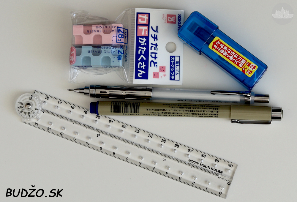 V škatuli sa nachádzala klasická pentelka od spoločnosti Pentel a fixka s modrým 0.5 mm hrotom (hoci vyzerá ako Sakura Pigma, v skutočnosti je od značky Kokuyo), no pre mňa boli tento mesiac zlatými klincami programu (alebo v tomto prípade celého boxu) skladacie pravítko od firmy Midori a gumy na gumovanie takisto od firmy Kokuyo.