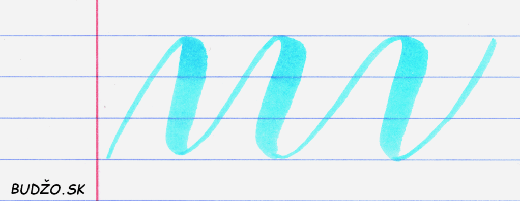 Tentoraz je našou úlohou horné a dolné čiary spojiť do jednej súvislej vlnovky. Tu už sa približujeme k samotnému písaniu písmen, ktoré sa mnohokrát z takýchto vlnoviek skladajú. Začnime od spodku riadka a potiahnime tenkú čiaru nahor. Potom zvrtnime zápästie a opäť pritlačme, keď budeme hrotom klesať nadol. Výsledkom by mala byť vlnovka, akú môžete vidieť na spodnom obrázku.