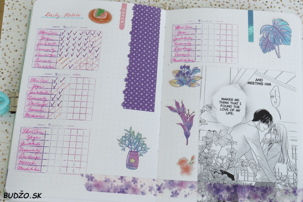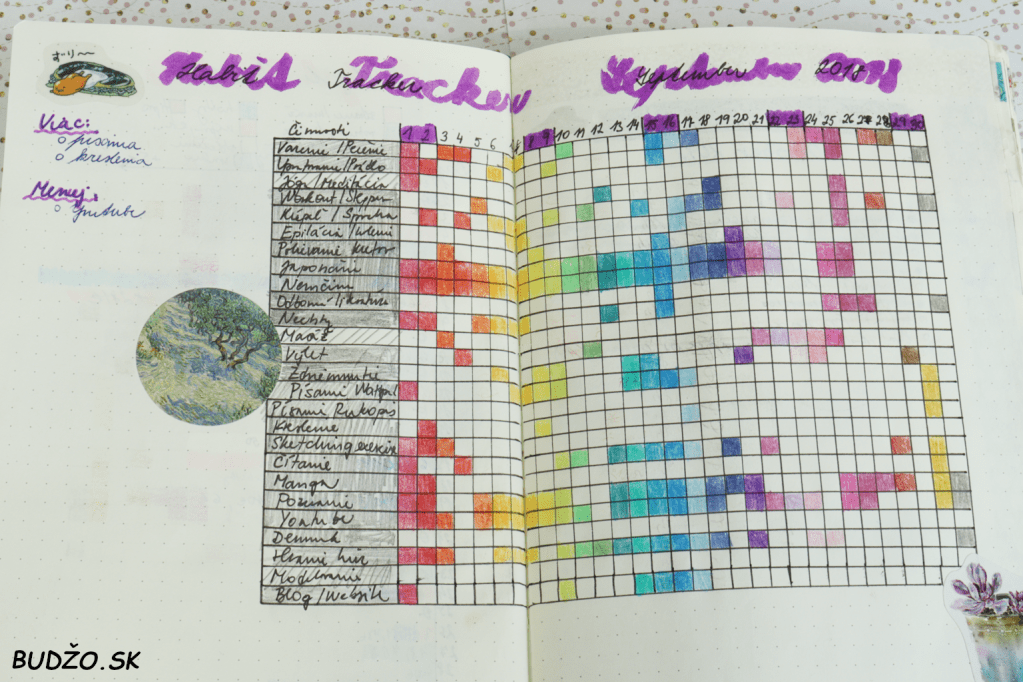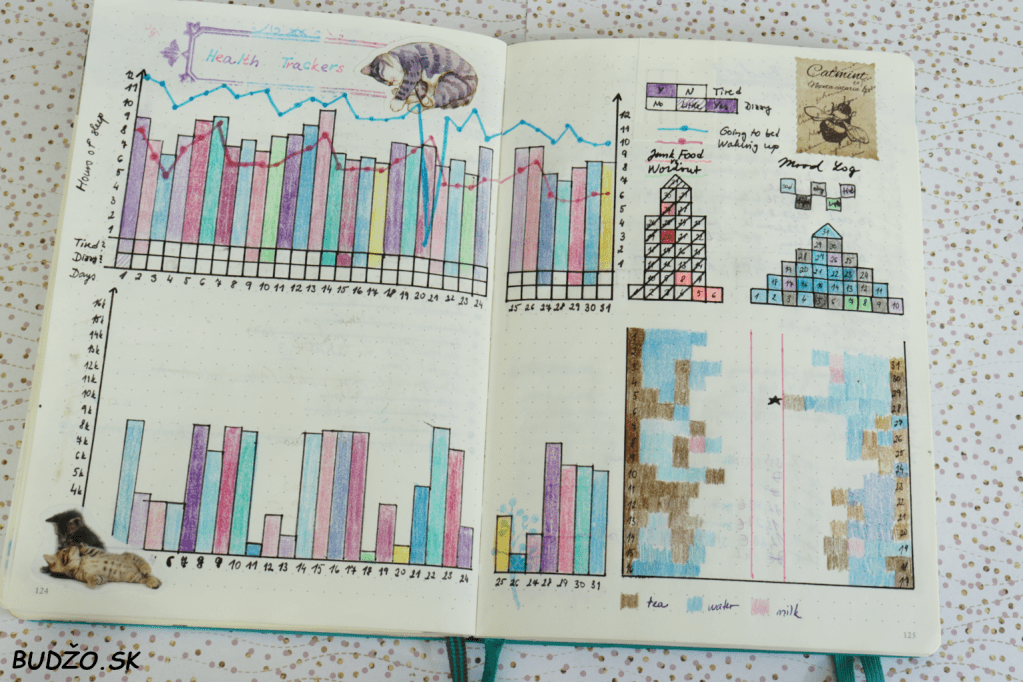 Nuž, učíme sa hlavne na vlastných chybách a takto bolo aj pri mojom odrážkovom zápisníku. Bola som príliš upnutá na to, aby moje zápisníky vyzerali rovnako pekne ako tie na internete, ale aby boli zároveň praktické. Začala som si značiť rôzne, povedzme si to priamo – hlúposti a to len preto, lebo to značili ľudia, ktorí si takisto vytvárali svoje vlastné budžo zápisníky. A tak som mesiace v roku 2018 trávila tým, že som si v papierových stránkach rysovala tabuľky so štvorčekmi, ktoré som vyfarbovala podľa toho, čo som robila. Sledovala som ako dlho spím, či koľko vody som počas dňa vypila.