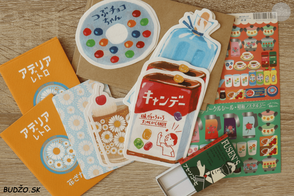 Tento mesiac od RyuRyu dostanete i jeden hárok samolepiek s témou Showa nostalgie. Obdobie 1926-1989 bolo pre Japonsko obdobím veľkých zmien a okrem toho nechýbalo množstvo obľúbených výrobkov, či sladkostí. Dokonca i spomínané sklenené poháre nájdete vyobrazené v tejto samolepkovej sade. Nechýbajú sójové omáčky, či smaltované hrnce. S množstvom týchto výrobkov sa vám možno budú spájať i naše osemdesiate roky.