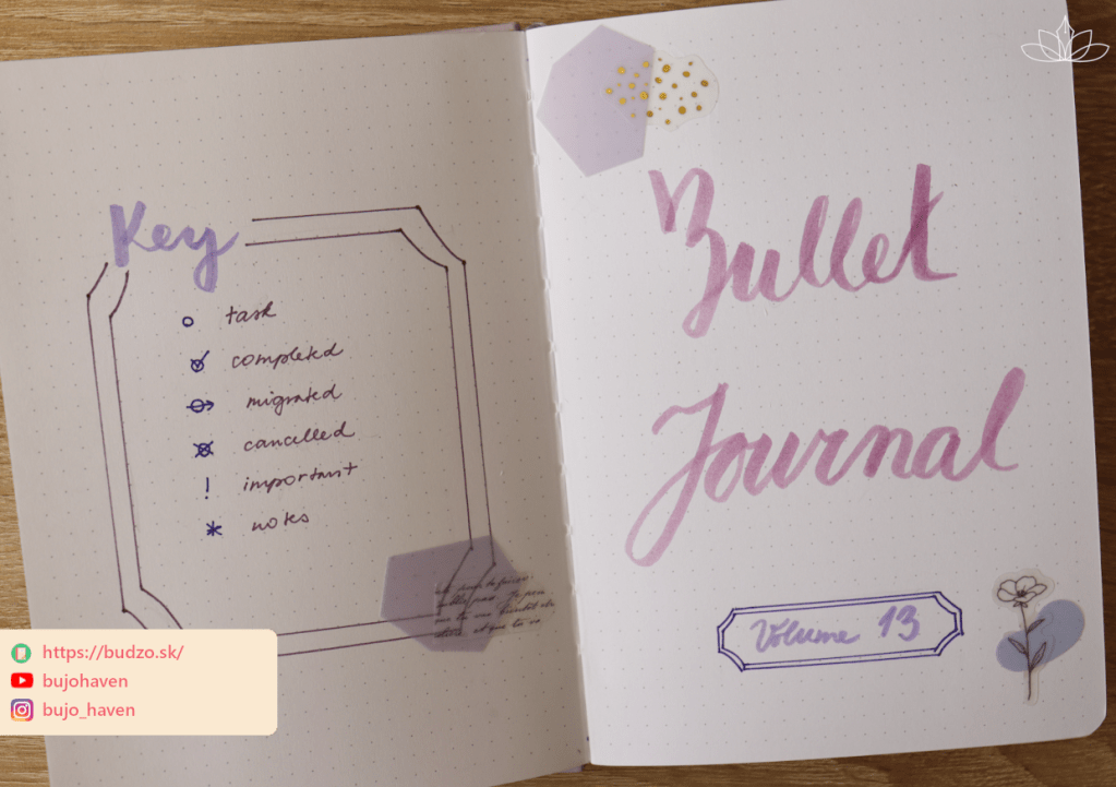 Jednou zo stálic v mojom odrážkovom plánovači je úvodná stránka s názvom a poradovým číslom môjho bullet journalu a kľúč s jednotlivými vysvetlivkami. Nepoužívam extrémne komplikované značky, pri ktorých musíte mať kľúč na to, aby ste im rozumeli. Namiesto toho sa zameriavam na klasické symboly, ktorým intuitívne rozumie väčšina z nás.